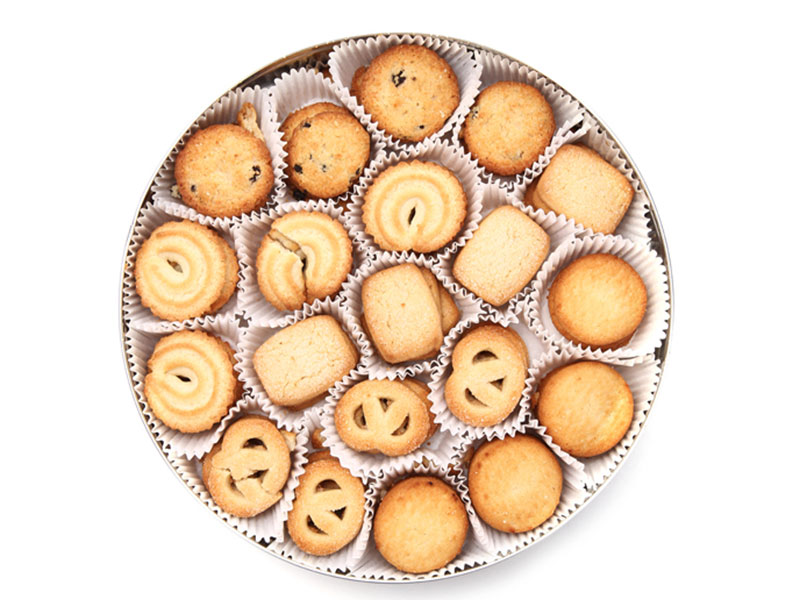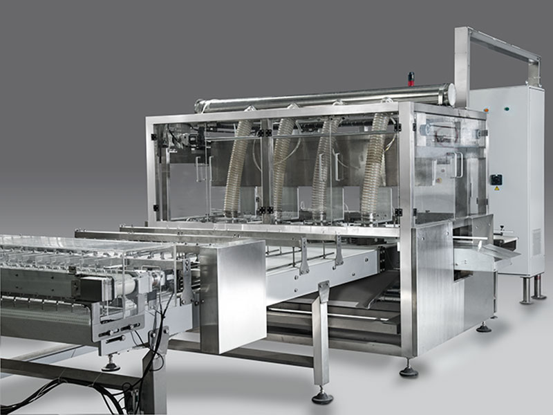Este sistema trabaja junto con el sistema de carga de pirotines de papel para llevar a cabo el proceso de envasado automático de galletas (sistema de carga de pirotines y latas para galletas) después del horneado.